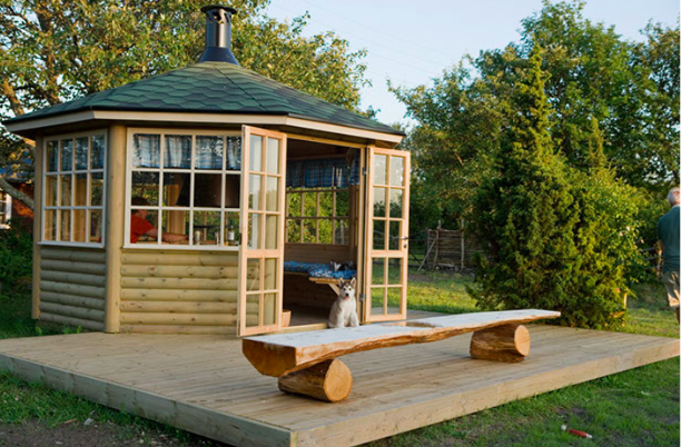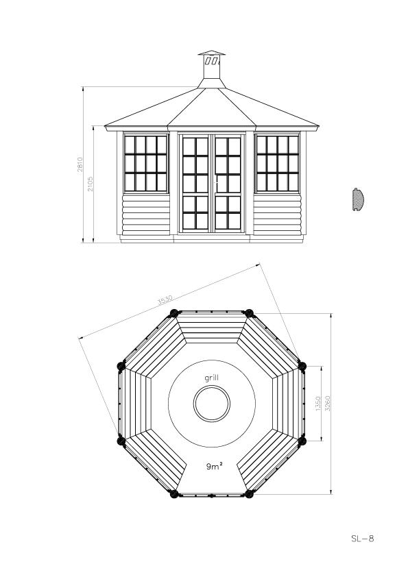 Grillmaja komplekti kuulub: sügavimmutatud põrandatalastik 45x90mm, valmis põranda- ja katuseelemendid (kolmnurksed kilpidest sektorid), pingid, kinnitusvahendid, katusekattematerjal. Katuse kalle 24°, kate kärgruberoid (reaplaate 5 pakki, harjaplaate 2,5 pakki)